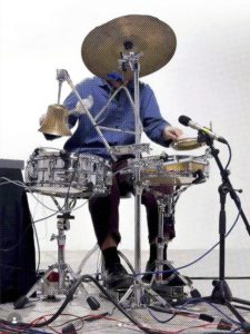 Shakeeb Abu Hamdan’s sound-based work spans performance, experimental composition and sound for film. He plays an unorthodox setup of drums, bells and cymbals which he augments and amplifies with surface transducers, microphones, pitch and rhythmic modulation effects, modified megaphones and other electronic devices. Performances unfold along loose structures that leave space for generative accidents and improvisation, responding to the instabilities of feedback manipulation and other unpredictable interactions built into his instrumental system.